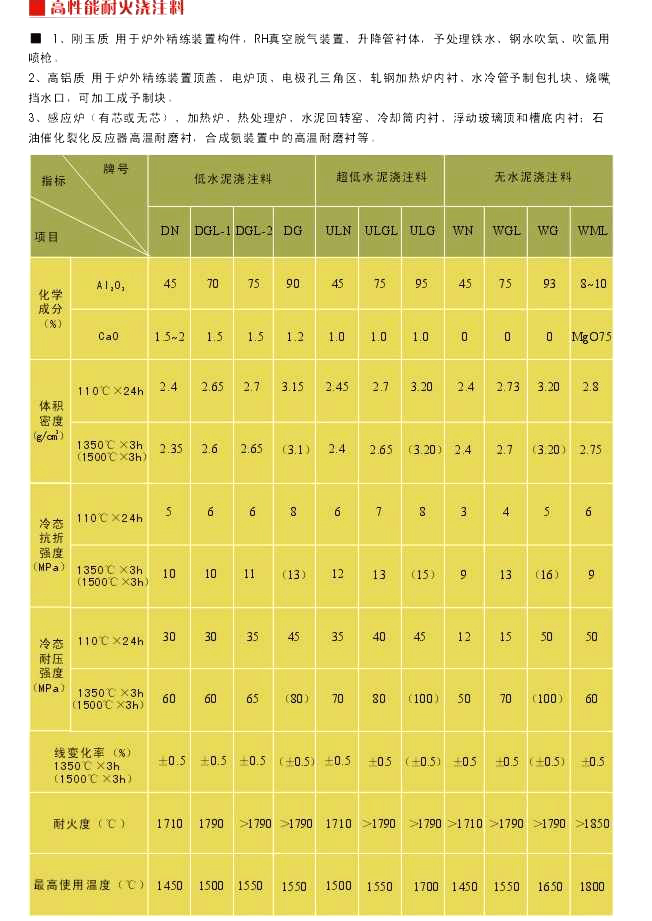 昌达耐材生产的低水泥浇注料、超低或无水泥浇注料用与主材质化学成分相同或相近的超微粉取代大部分或者全部水泥,精致、科学运用优化颗粒级配、微粉、颗粒形态等因素,同时加入微量的分散剂(减水剂)及适量缓凝剂等复合外加剂配制而成。低水泥浇注料主要用于冶金、电力、有色、石化、建材等行业。如玻璃窑槽底、水泥窑前后窑门罩冷却机前端等耐高温部位、前后窑口、喷煤管等;加热炉、均热炉等各种热处理炉;中频感应炉内衬、石油化工催化裂化反应器的高温耐磨衬里、其它工业炉窑衬里。可采用现场浇注、涂抹和捣打的施工方式。